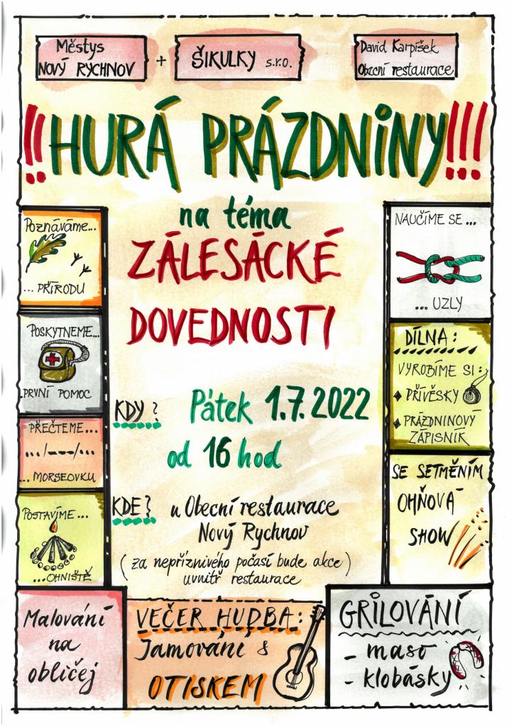 Hurá prázdniny!!! - na téma "zálesácké dovednosti" (poznáváme přírodu, poskytneme první pomoc, přečteme morseovku, naučíme se uzly, vyrobíme si přívěsky a prázdninový deník); se setměním ohňová show, večer hudba: OTISK, grilování-maso-klobásky